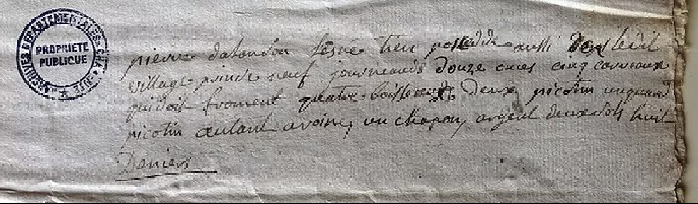 C’est un total de quarante boisseaux de froment, autant d’avoine, huit chapons, ainsi que trois livres et dix sols qui sont dus à titre de rente au prince de Chalais, et qu’il faut répartir entre chacun au prorata de la surface cultivée. Notre René Bodet doit ainsi s’acquitter de « trois picotins [un picotin fait le quart d’un boisseau] et demy et un douzième de picotin, autant avoine, la douzième partie d’un chapon, argent sept deniers ».