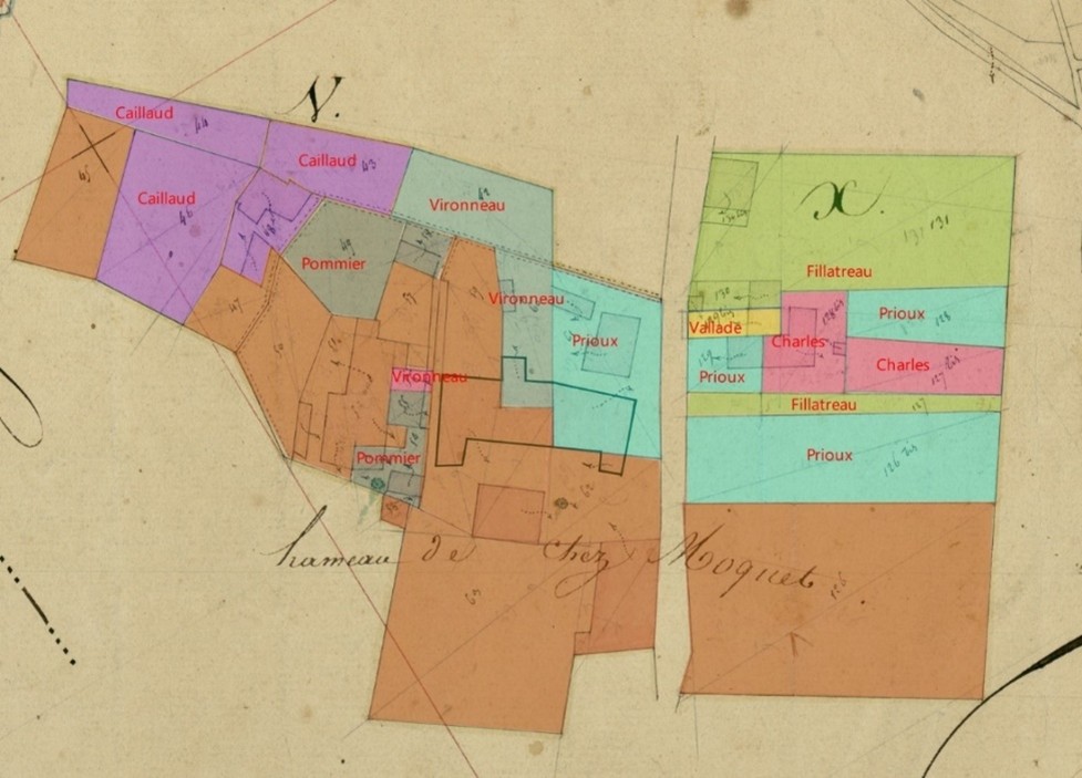 Huit propriétaires se partageaient le hameau de Moquet, de façon assez inégale : la matrice note les noms de Constantin, Caillaud, Pommier, Vironneau, Priou, Fillatreau, Charles, Vallade. Le schéma suivant montre clairement cet enchevêtrement de parcelles.