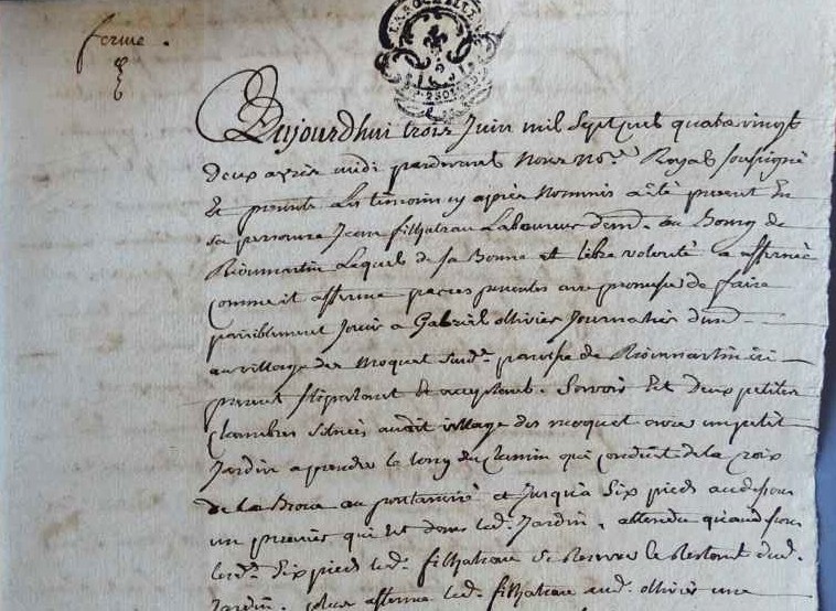 Troisième étape : le 18 mai 1817, Jean Constantin achète à un autre Jean Filhatreau habitant la Broue « la cinquième partie lui revenant dans les biens mobiliers et immobiliers à lui échue de la succession de autre Jean Filhatreau son oncle, les immeubles consistant en bâtiments et jardin situés au village de chez Moquet en ladite commune de Rioux-Martin ». Françoise Ollivier garde également la jouissance sa vie durant de ce cinquième.