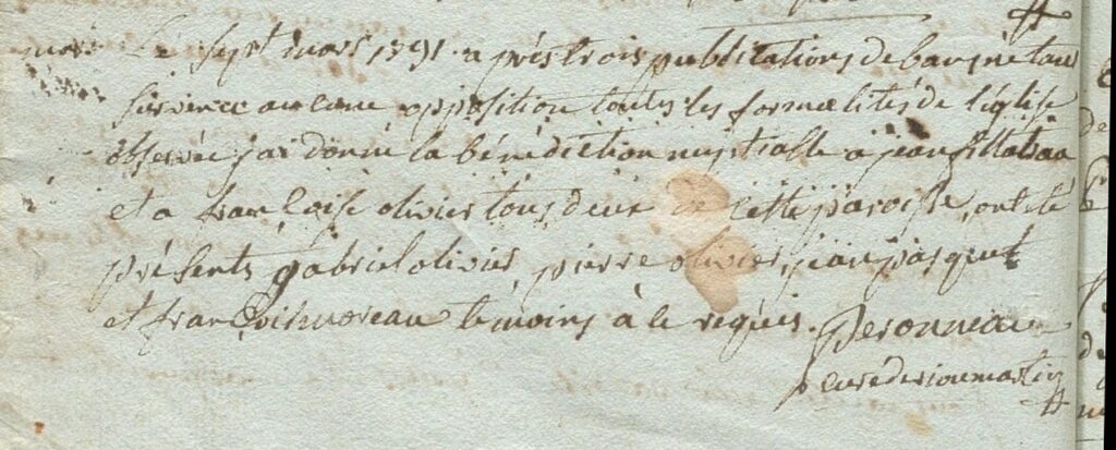 Deuxième acte : le 27 décembre de la même année, le même Jean Constantin fait un échange avec un autre Jean Fillatreau, mais cette fois il s’agit d’un neveu de l’ancien propriétaire. Par cet échange, Jean Constantin acquiert « la quinzième partie d’une petite chambre et petit jardin en dépendant venant de la succession de Jean Filhatrau, oncle du contractant, de laquelle il ne pourra s’emparer qu’après le décès de Françoise Ollivier sa veuve ». Cette fois, ce n’est plus un cinquième, mais le quinzième de ces quelques six m²… et ce n’est pas une erreur, c’est bien écrit en toutes lettres.