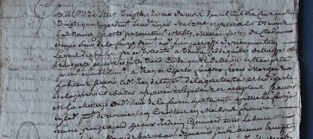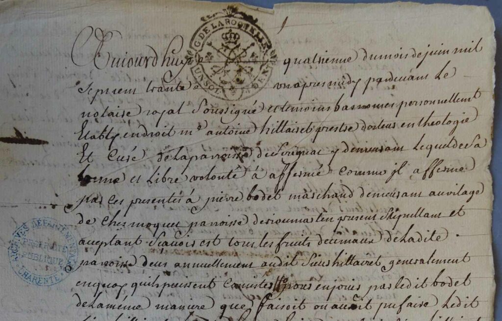Aujourd’hui quatrième du mois de juin mil sept cent trente et un après midi pardevant le notaire royal soussigné et témoins bas nommés personnellement établi en droit maître Antoine Hillairet prêtre docteur en théologie et curé de la paroisse de Sérignac y demeurant lequel de sa bonne et libre volonté a affermé comme il afferme par les présentes à Pierre Bodet marchand demeurant au village de chez Moquet paroisse de Rioux-Martin présent stipulant et acceptant savoir et tous les fruits décimaux de la dite paroisse dus annuellement audit sieur Hillairet…
