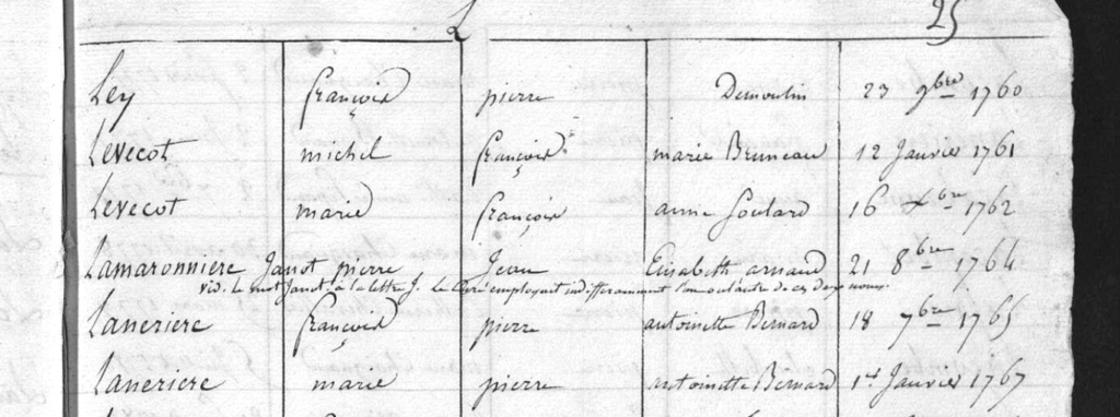J’ai en effet trouvé la mention suivante sur les tables décennales de Berneuil (1750-1792) au-dessous de la ligne concernant Pierre Lamaronnière, un cousin d’Etienne : « voir le mot Janot à la lettre J, le curé employant indifféremment l’un ou l’autre de ces deux noms ».