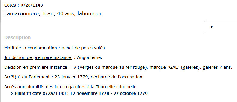 Si je remonte mon ascendance Lamaronnière, je trouve bien un couple Jean Lamaronnière x Marie Blanc, marié en 1766 à Châtignac. Les dates sont cohérentes, et ce patronyme n’étant pas très répandu, il est donc fort probable que je descende d’un galérien… Ou plutôt que j’ai failli en descendre, car le Parlement de Paris qui à l’époque représentait l’instance d’appel d’un premier jugement les a déchargés de toute accusation et les a donc innocentés, ouf ! J’espère seulement pour eux que concernant le marquage au fer rouge, l’appel était suspensif !