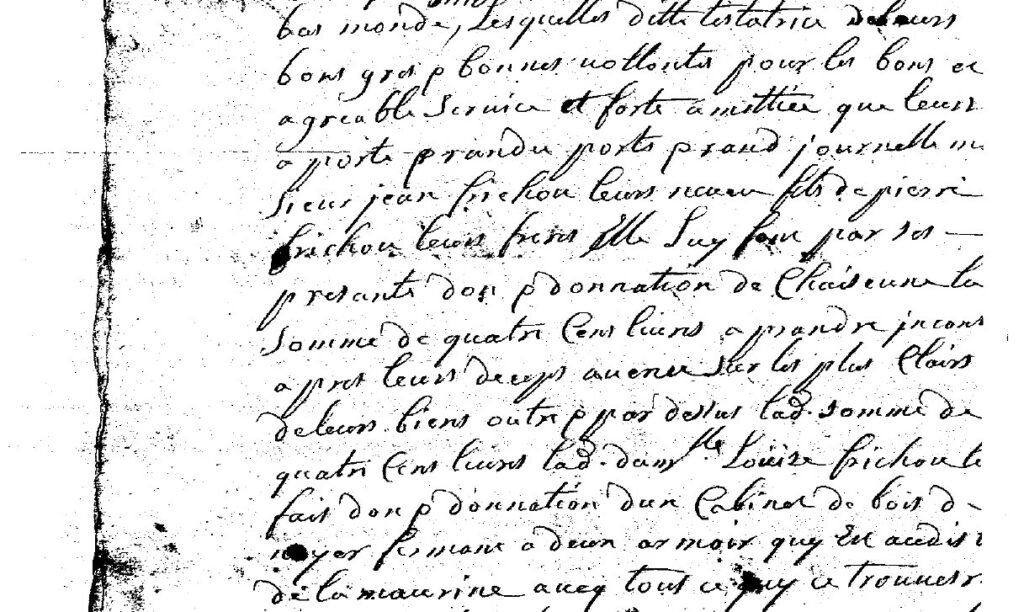 Pierre Frichou de la Morine avait en effet deux sœurs, décédées sans descendance, qui habitaient elles aussi la Morine (on trouve les deux orthographes, la Morine et la Maurine : c’est sous cette dernière orthographe que ce lieu-dit de la Genétouze existe aujourd’hui). Ce testament ne dit pas qu’elles déshéritent qui que ce soit, qui plus est à cause d’une abjuration… mais il ne cite que Jean (resté protestant) et indique que « pour les bons et agréables services et forte amitié que leur a porté et rendu, porte et rend journellement sieur Jean Frichou leur neveu, fils de Pierre Frichou leur frère, elles lui font par ces présentes don et donation de chacune la somme de quatre cents livres […] plus un cabinet de bois de noyer fermant à deux armoires qui est à ce dit lieu de la maurine avec tout ce qui se trouvera dans y celui ».