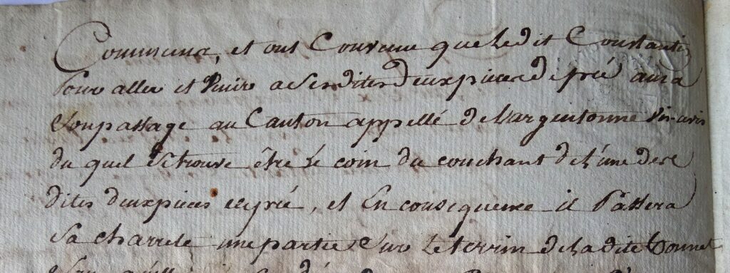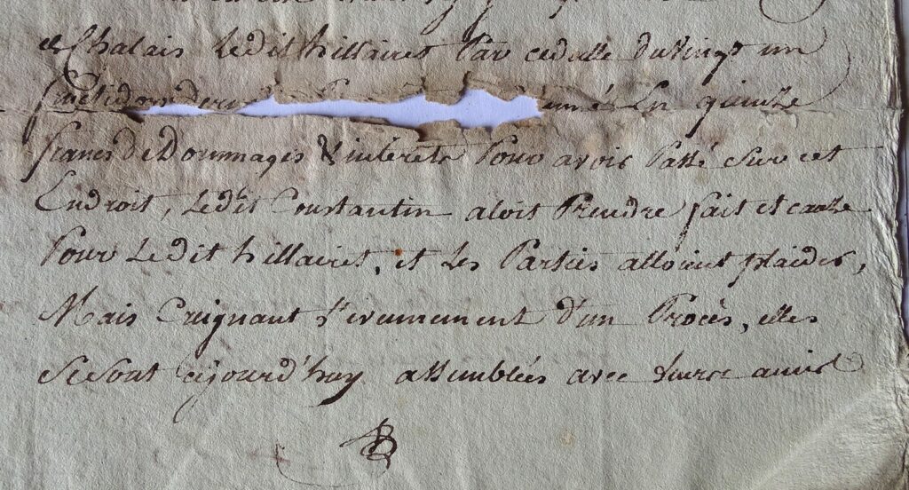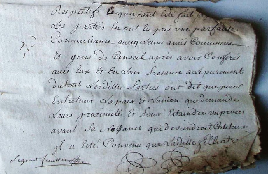 On peut lire dans la suite de cet acte l’importance de l’entourage et le souci de calmer à temps les conflits entre personnes qui vivent dans une grande proximité, voire promiscuité, dans les mêmes habitations : l’acte en vient en effet « à la fixation des droits respectifs […] les parties en ont pris une parfaite connaissance avec leurs amis communs et gens de conseil après avoir conféré avec eux et en leur présence à l’épurement du tout, lesdites parties ont dit que pour entretenir la paix et l’union que demande leur proximité et pour éteindre un procès avant sa naissance qui deviendrait coûteux il a été convenu que… » (photo ci-dessus).