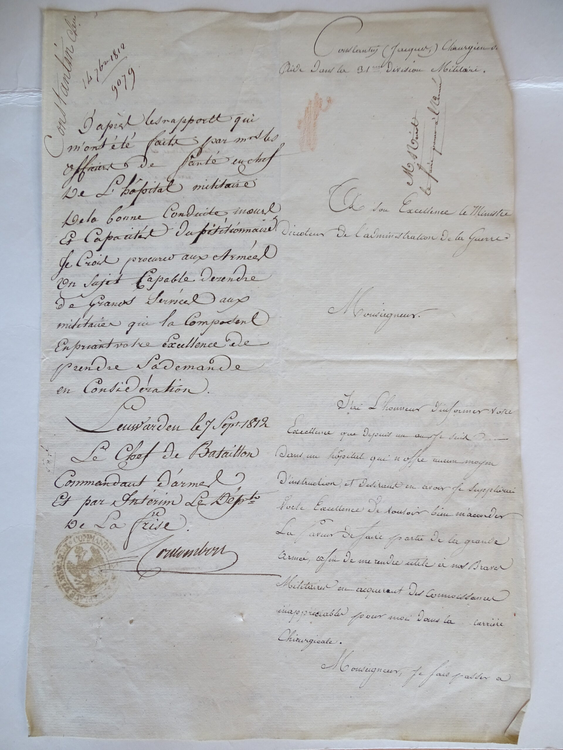 Le temps a dû lui paraître long si on en juge par la demande qu’il adresse au Ministre Directeur de l’Administration de la Guerre. Cette correspondance datée du 7 septembre 1812 a pour objet une demande d’affectation à la Grande Armée et sa promotion au grade d’Aide-Major. En mention marginale, cette demande est appuyée par le chef de bataillon : « d’après les renseignements qui m’ont été faits par Monsieur l’officier de santé en chef de l’hôpital militaire de la bonne conduite morale et capacité du pétitionnaire, je crois procurer aux Armées un sujet capable de rendre de grands services aux militaires qui la composent », et toujours en mention marginale cette appréciation du commissaire de guerre du département de la Frise : « qu’il en a recueilli tous les témoignages les plus flatteurs en sa faveur ». Daté de la même date, le commissaire de la guerre du département de la Frise appuie la demande dans un courrier distinct. Le Ministre fera, en partie, droit à cette demande puisque par un ordre du 21 octobre 1812, il lui est signifié qu’il est nommé à compter du 17 octobre « pour être attaché en qualité de chirurgien sous-aide au 11ème C.A (Corps d’Armée). de la Grande Armée, 31ème Division d’Infanterie » de quitter Groninge et de se rendre sur le champ au Quartier Général du 11ème C.A., où il devra être arrivé, à Bremen le 4 novembre.