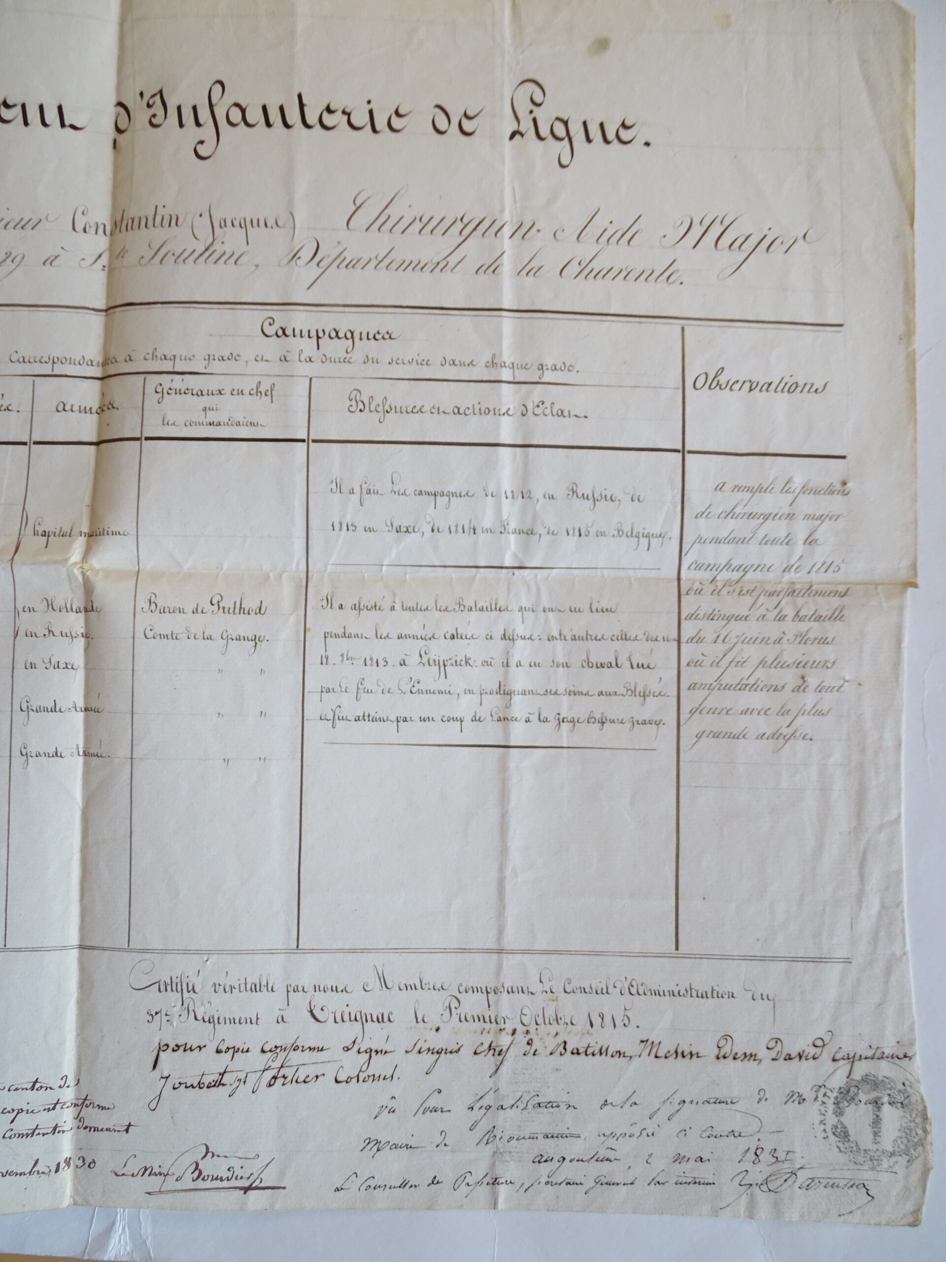 Par l’état des services et campagnes, nous savons que l’Aide-major Jacques Constantin « a rempli les fonctions de chirurgien-major pendant toute la campagne de 1815 où il s’est parfaitement distingué à la bataille du 16 Juin à Fleurus où il fit plusieurs amputations de tout genre avec la plus grande adresse ».
