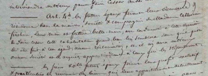 Logiquement, ils auraient dû habiter Moquet : c’est en effet ce que prévoit leur contrat de mariage. Il stipule que « les futurs époux feront leur demeure et résidence dans la maison de Madame Catherine Frichou, leur mère et future belle-mère, avec la faculté à cette dernière de faire cesser cette cohabitation quand bon lui semblera sans qu’il puisse lui être fait à cet égard aucune réclamation… »