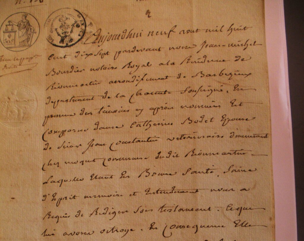 le 12 décembre 1655 René Bodet et Guilhemette Dalanson ont reçu le saint sacrement du mariage dans l’église de Rioux-Martin en présence de Marie Dallansson, Michel Bodet, de Jean Champagnge, de Félix Raboin, et plusieurs autres de leurs parents et amis, le saint sacrement leur a été conféré par moi sous signé De Lussaud prêtre (voir l’acte)