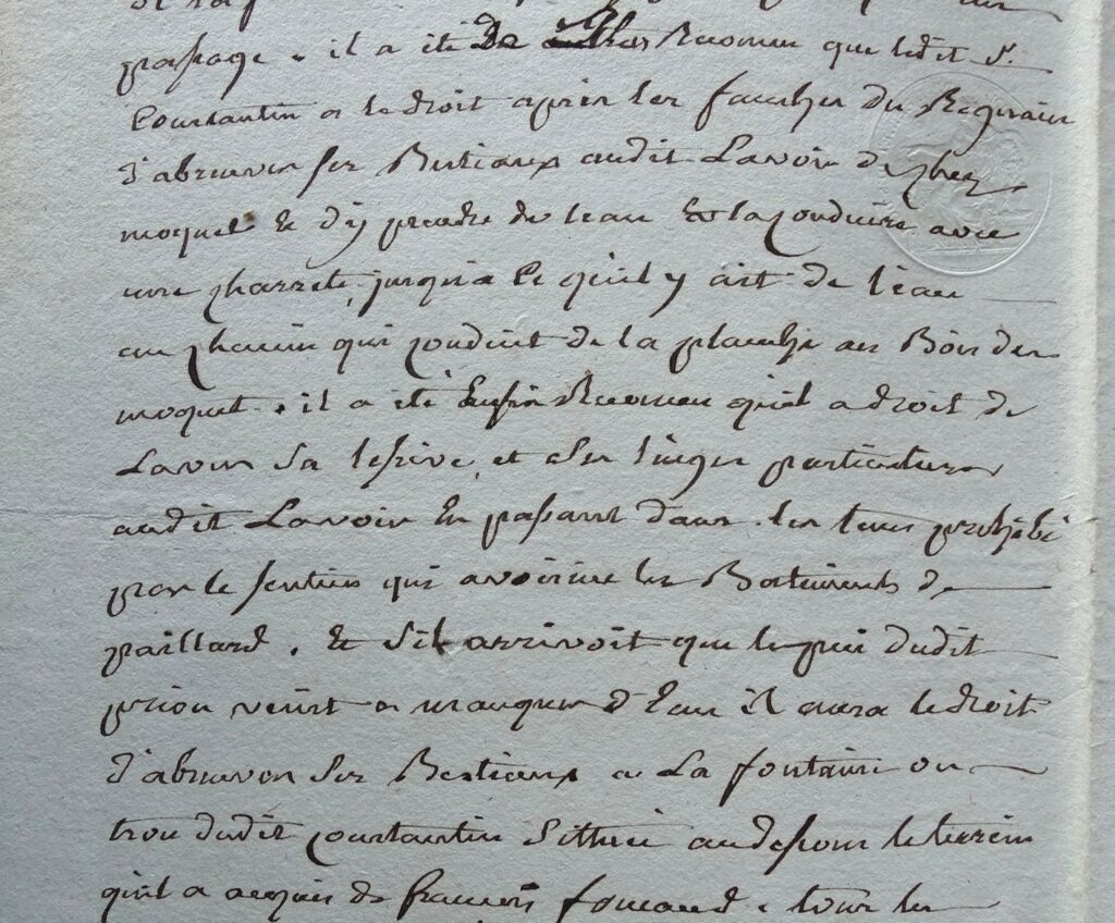 En 1812, autre échange avec Pierre Priou cette fois, habitant lui aussi à Moquet. Il ne s’agit que de petites pièces de pré, mais cela permet de modifier des droits de passage. L’acte mentionne ainsi : « en outre, ledit Priou a reconnu ne point avoir droit de passage sur un pré dudit Constantin situé au même lieu pour aller et venir à sa pièce de terre appelée au Bois des Moquets [sous Paillard]attendu qu’ils aboutissent au chemin. Et ledit Constantin de son côté a aussi reconnu ne point avoir droit de passer sur la pièce de terre dudit Priou appelée sur les terriers, attendu que celle dudit Constantin au-dessus se trouve joindre le chemin qui conduit de chez Moquet au canton de la Feuilleterie et qu’il y peut pratiquer un passage. Il a été reconnu de plus que ledit Constantin a le droit après la fauche du regain d’abreuver ses bestiaux audit lavoir de chez Moquet et d’y prendre de l’eau et de la conduire avec une charrette jusqu’à ce qu’il y ait de l’eau au chemin qui conduit de la Planche au bois de Moquet. Il a été reconnu qu’il a le droit de laver sa lessive et son linge particulier au lavoir en passant dans la terre (prohibée ?) par le sentier qui avoisine le bâtiment de chez Paillard. S’il arrivait que le pré dudit Priou vienne à manquer d’eau, il aurait le droit d’abreuver ses bestiaux à la Fontaine ou trou dudit Constantin situé au-dessus du terrain qu’il a acquis de François Foucaud. »