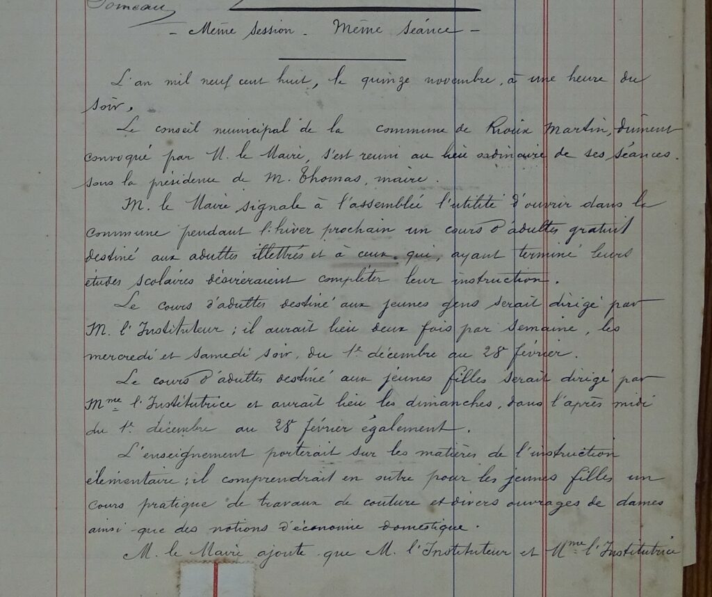 On notera qu’à la première réunion qui suit son élection, une décision a été votée : « des cours pour les adultes illettrés ou qui désireraient compléter leur instruction ». Ces cours porteront sur les matières de l’instruction élémentaire, seront assurés par l’instituteur pour les hommes, deux soirs par semaine, du 1er décembre au 28 février et par l’institutrice pour les femmes le dimanche après-midi de la même période, avec en plus de la couture et de l’économie domestique. Les deux assureront ces cours gratuitement. En somme, mon arrière-grand-oncle est à l’initiative de l’éducation populaire à Rioux-Martin !