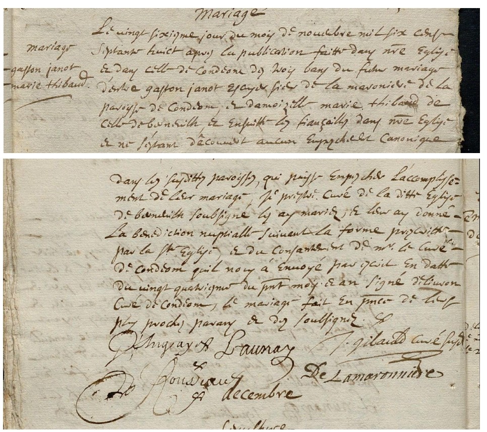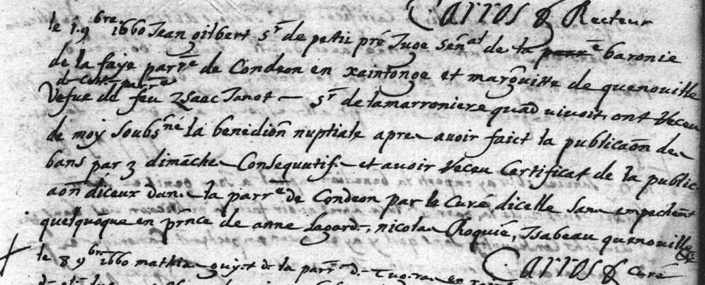 Le 1er novembre 1660 Jean Gilbert sieur de petit pré juge sénéchal de la baronnie de la Faye paroisse de Condéon en Saintonge et Marguerite de Quenouille de cette paroisse veuve de feu Izaac Janot sieur de Lamaronnière quand vivait ont reçu de moi soussigné la bénédiction nuptiale…