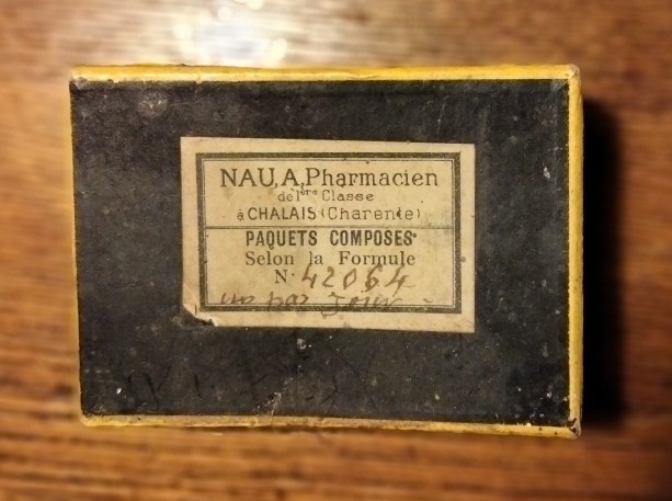 Adrien Nau est « pharmacien de première classe » à Chalais. C’est un décret du 22 août 1854 qui officialise la distinction entre les deux classes de pharmacien. Celui de 1ère classe pouvait exercer sur tout le territoire national tandis que celui de 2ème classe était limité à l’exercice dans son département de réception. Pour être pharmacien de 1ère classe, il fallait être détenteur du baccalauréat ès sciences2, avoir trois années de pratiques en officine et trois autres années d’études en école supérieure, et passer enfin l’examen correspondant. Les pharmaciens de 2ème classe quant à eux n’avaient besoin que d’un certificat de grammaire et d’un examen de physique, chimie et histoire naturelle, ils devaient avoir soit quatre années de stage en officine et deux ans en école supérieure, soit six années de stage et un an en école supérieure. Un décret en 1878 égalise les formations des deux classes, mais sans aucun doute Adrien avait-il déjà terminé ses études car c’est en 1877 qu’il achète la pharmacie de Chalais.