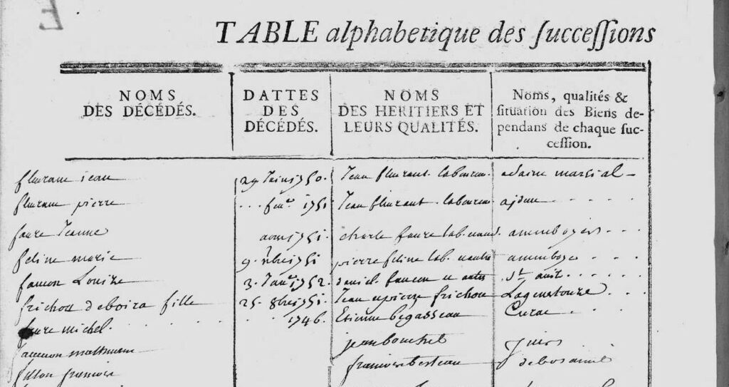 Mais ce testament stipule ensuite que « de tous leurs autres biens non donnés ni légués elles ont les dites testatrices institué et instituent leurs héritiers universels ceux qui de droit et de coutume le doivent être qui se trouveront après leurs décès ». Autrement dit, elles ont favorisé leur neveu Jean mais pour le reste elles en sont restées à ce que le droit et la coutume prévoyaient. D’ailleurs, sur la table des successions dressées par l’administration du contrôle des actes des notaires, on trouve comme héritier de Deborah et Jean et Pierre Frichou.