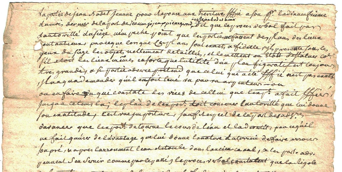Dans les papiers conservés à Moquet figure un mémoire ou plus exactement une partie de mémoire du 30 juin 1764 (Jean Bodet le jeune contre Jean Bodet l’aîné et autres, dont un extrait figure en tête de cet article) concernant une question d’irrigation : manifestement Jean le jeune, qui habite alors Tétaud, est accusé de détourner une partie des eaux du Riou de Badou et ce texte présente sa défense, démontrant que toute l’eau qu’il utilise revient dans le Riou de Badou et donc que cela ne porte en rien préjudice à ceux qui l’accusent. Ambiance là encore…