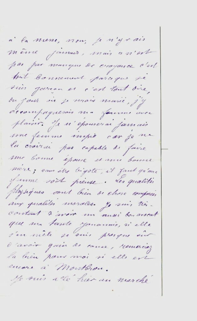 Quant à moi, physiquement je ne suis pas plus beau qu’un autre mais moralement, au risque d’être traité de fat, j’en connais beaucoup qui valent moins que moi. Il m’arrive souvent d’entendre des jeunes gens de mon âge et de plus jeunes dire : quand je serai marié, si jamais ma femme se permet de vouloir aller à l’église, je me séparerai d’elle, ou d’autres propos à peu près semblables. Pour eux il suffit d’être curé pour être malhonnête homme, tout ce qui est religion, Dieu lui-même, n’échappe pas à leur médisance3. Pour moi, j’ai été élevé par ma mère dans la crainte de Dieu et je m’en trouve bien. Je crois qu’il n’y a pas de société possible sans morale et de morale sans religion… Je ne veux point vous dire que je vais souvent à la messe, non, je n’y vais même jamais, mais ce n’est pas par manque de croyance, c’est tout bonnement parce que je suis garçon et c’est tout dire, du jour où je serais marié, j’y accompagnerai ma femme avec plaisir. Je n’épouserai jamais une femme impie car je ne la croirai pas capable de faire une bonne épouse et une bonne mère ; sans être bigote, il faut qu’une femme soit pieuse. Les qualités physiques sont bien [peu] de chose comparées aux qualités morales. Je suis très content d’avoir un aussi bon avocat que ma tante Jouannis, si elle s’en mêle je suis presque sûr d’avoir gain de cause, remerciez-la bien pour moi si elle est encore à Montbron. »