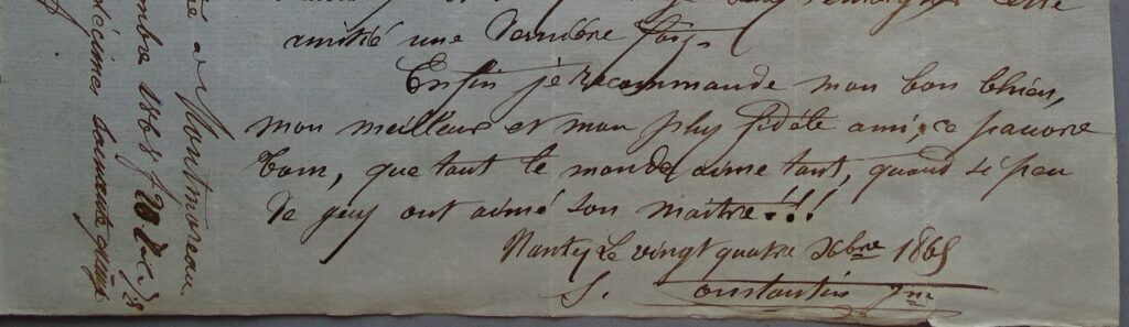 Comme vous allez à Montmoreau un de ces jours si vous n’y êtes déjà, ayez la bonté d’en parler à mon père, il vous renseignera on ne peut mieux, c’est comme vous le savez un bon vieux qui fera je crois un bon beau-père.