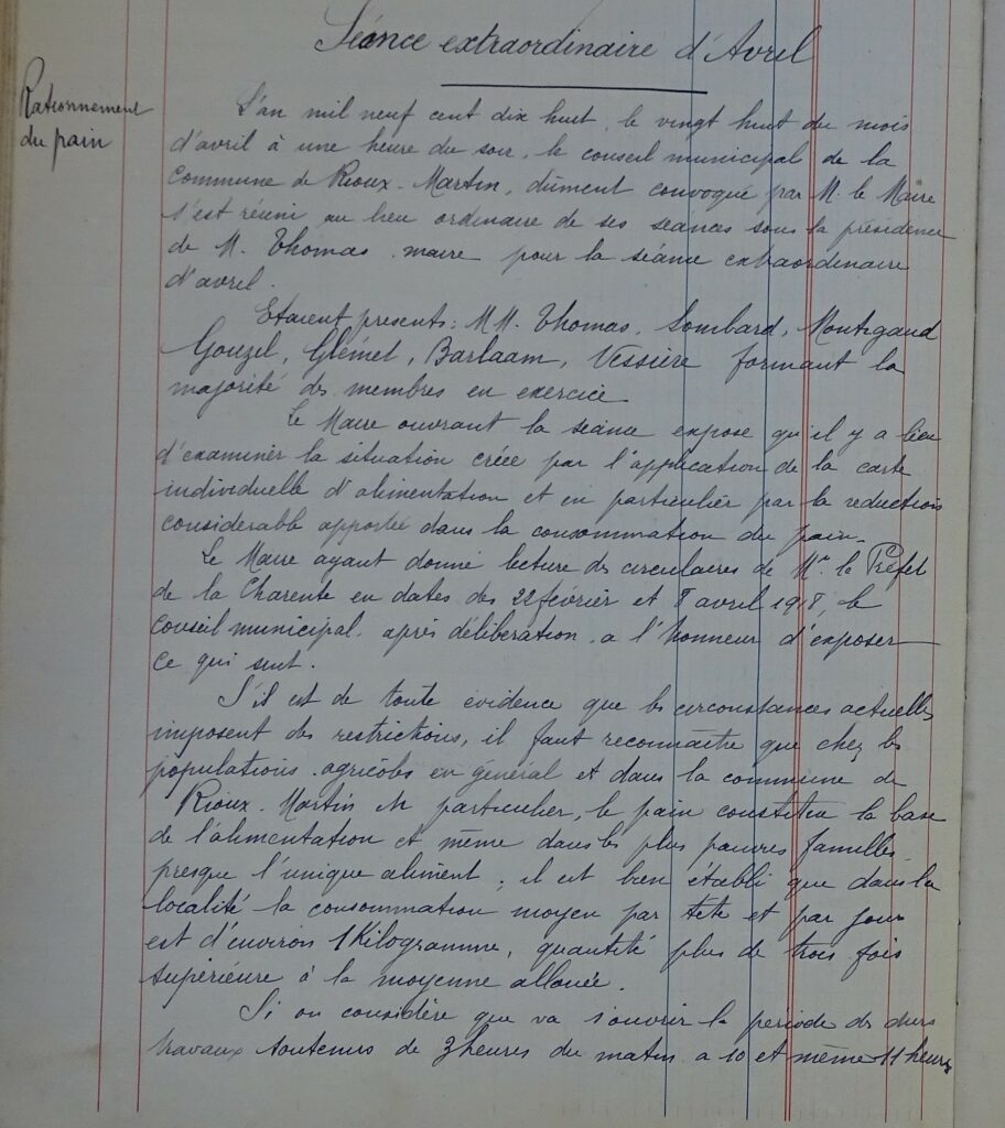 Les difficultés concernent également l’alimentation. Les récoltes baissent (en 1919, la récolte de blé est en France au tiers de sa capacité), la pénurie engendre le marché noir et dès 1915, on envisage de rationner le pain. Ce n’est cependant qu’à partir d’août 17 que la farine et le pain seront rationnés. D’autres produits le seront également, comme la viande, le sucre, voire ici ou là le lait. En Charente, deux nouvelles circulaires préfectorales, en février et avril 1918, renforcent le rationnement et le conseil réagit. On peut citer ici plus longuement le PV du conseil d’avril 1918 : « S’il est de toute évidence que les circonstances actuelles imposent des restrictions, il faut reconnaître que chez les populations agricoles en général et dans la commune de Rioux-Martin en particulier, le pain constitue la base de l’alimentation et même dans les plus pauvres familles presque l’unique aliment ; il est bien établi que dans la localité, la consommation moyenne par tête et par jour est d’environ 1 kg, quantité plus de trois fois supérieure à la moyenne allouée. Si l’on considère que va s’ouvrir la période des durs travaux soutenus de 3 heures du matin à 10 et même 11 heures du soir, la ration de 400 grammes pour un adulte, 200 grammes pour un homme de plus de 60 ans, est évidemment insuffisante pour entretenir les forces. […] Or, les hommes de 19 à 48 ans étant aux armées, les femmes, les vieillards et les enfants les ont courageusement remplacés. Peu de terres sont restées en friches. Réduire ces travailleurs à la portion congrue serait une injustice qui répandrait le découragement. […] D’autre part, il est à prévoir que le rationnement exagéré des campagnes aura une répercussion fâcheuse sur l’alimentation des villes. Le cultivateur privé de pain cherchera un complément de nourriture dans les produits qu’il écoulait sur le marché : au lieu de pousser ses veaux jusqu’à trois et quatre mois, il les vendra à un mois et consommera le lait de ses vaches. Les œufs, les volailles seront également consommés à la campagne, il en résultera une raréfaction des vivres et une hausse considérable qui pourrait devenir un danger pour l’ordre public. » L’ordre public : voilà une façon de parler que peut comprendre un préfet !