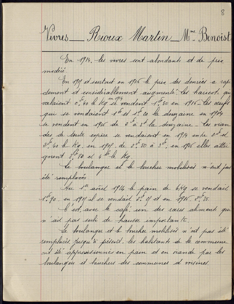 Rioux-Martin comptait alors « trois petites épiceries » (pour une population de 507 habitants au recensement de 1911), et Mme Benoist note qu’elles « s’approvisionnent très difficilement et à des prix très élevés : le sucre, le sel, le pétrole, l’essence, la laine manquent souvent, le cours de toutes ces denrées a doublé […] Un kg de laine qi se vendait de 15 à 20 francs en 1915 se vend 30 et 35 francs en 1916« . Le porc gras qui se vendait à 1 franc le kg en décembre 14 se vend à 2,60 francs en 1915. Entre 1914 et 1916, le prix des haricots et des œufs a triplé, celui de la viande a doublé. Seul le pain n’a pas trop augmenté, celui de 6 kg passant de 1,90 franc en août 1914 à 2,35 francs en 1916. Ce sont les bouchers et boulangers voisins qui alimentent Rioux-Martin, ceux de la commune ayant été mobilisés et non remplacés.