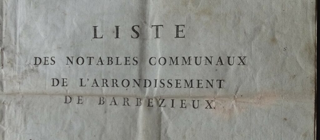 Bien d’autres dispositions ont restreint dès le début ou le droit de vote, ou sa portée. Ainsi en l’an IX (en 1800, on est alors sous le Consulat), était dressée une « liste de notables » au sein de laquelle le préfet choisissait maire et adjoint. On trouve ainsi aux Archives départementales la « Liste des notables communaux de l’arrondissement de Barbezieux ». En faisaient partie de droit les fonctionnaires municipaux, c’est-à-dire maire et adjoint et quelques « élus par le peuple ». Pour Rioux-Martin, on y trouve Jean Michel Bourdier, 55 ans, maire, et notaire installé à la Feuilleterie, ainsi que Jacques Ferrand, 40 ans, adjoint. S’y ajoutent trois citoyens élus : Léonard Bodet, 45 ans, meunier, Jean Chadefaud, 36 ans, lui aussi meunier, et Jacques Chadefaud, 52 ans, peut-être son frère.