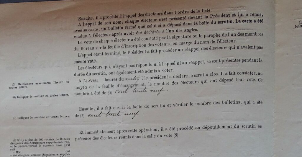 Sous le Second Empire, les conseillers municipaux sont élus au suffrage universel direct, et chaque habitant ou contribuable de la commune est éligible. Comment se passait alors le vote ? On lit sur le PV des élections municipales de 1870 de Rioux-Martin que le 7 août 1870 à 8 heures du matin, tous les électeurs de la commune ont été convoqués et « se sont réunis dans la salle de la mairie », sous la présidence du maire d’alors Jean Champagne (il a été maire de 1846 à 1908). La liste électorale comporte 200 noms et 139 ont effectivement voté. Une fois constitué le bureau de vote, on procède à l’appel nominal de chacun : « à l’appel de son nom, chaque électeur s’est présenté devant le président et lui a remis, avec sa carte, un bulletin fermé que celui-ci a déposé dans la boite du scrutin ». On notera que les bulletins n’étaient pas imprimés et qu’il fallait donc que chaque électeur inscrive les noms sur le bulletin, alors qu’une bonne partie de la population ne savait pas écrire… « à onze heures du matin, le président a déclaré le scrutin clos ». On notera que le maire sortant, Jean Champagne, recueille 137 suffrages, et que les votes se répartissent très inégalement, pour descendre à 84 voix pour le douzième et dernier élu, et à 14 pour le dernier de la liste.