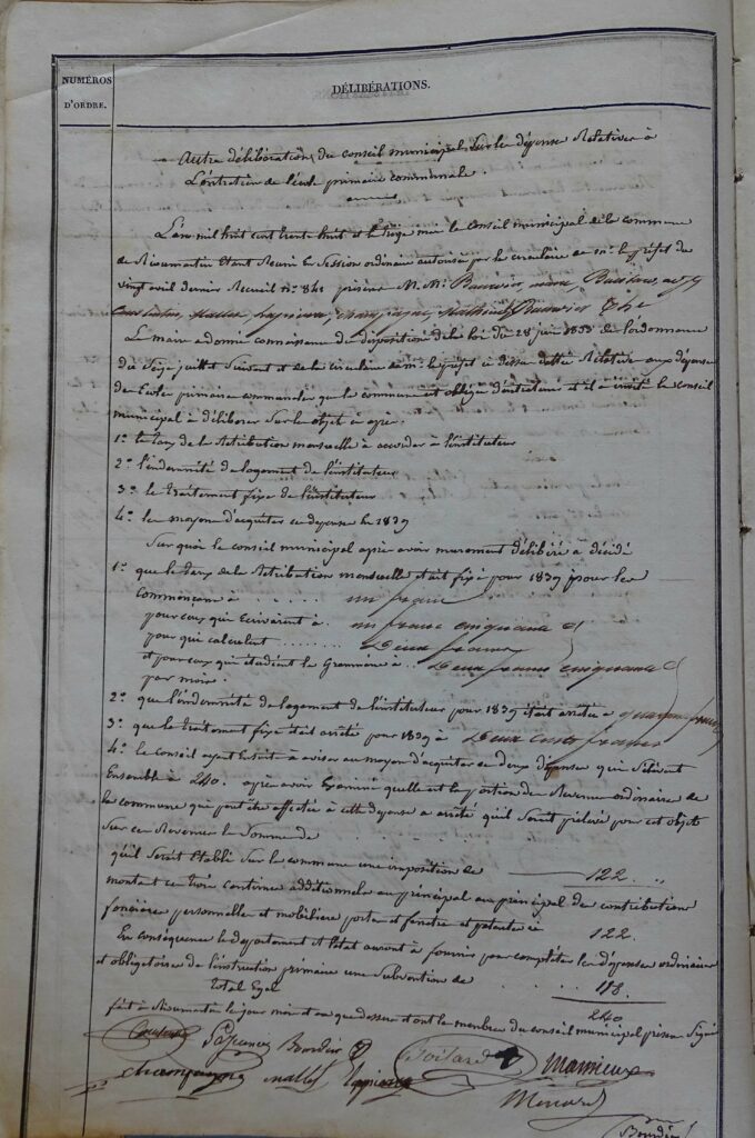 Tout le monde le sait : Jules Ferry a rendu l’instruction gratuite et obligatoire, mais qu’en était-il exactement avant ? En prenant comme fil directeur les délibérations du conseil municipal de Rioux-Martin depuis 18381, ce qui suit montre comment la commune a progressivement assuré l’instruction de sa jeunesse2.