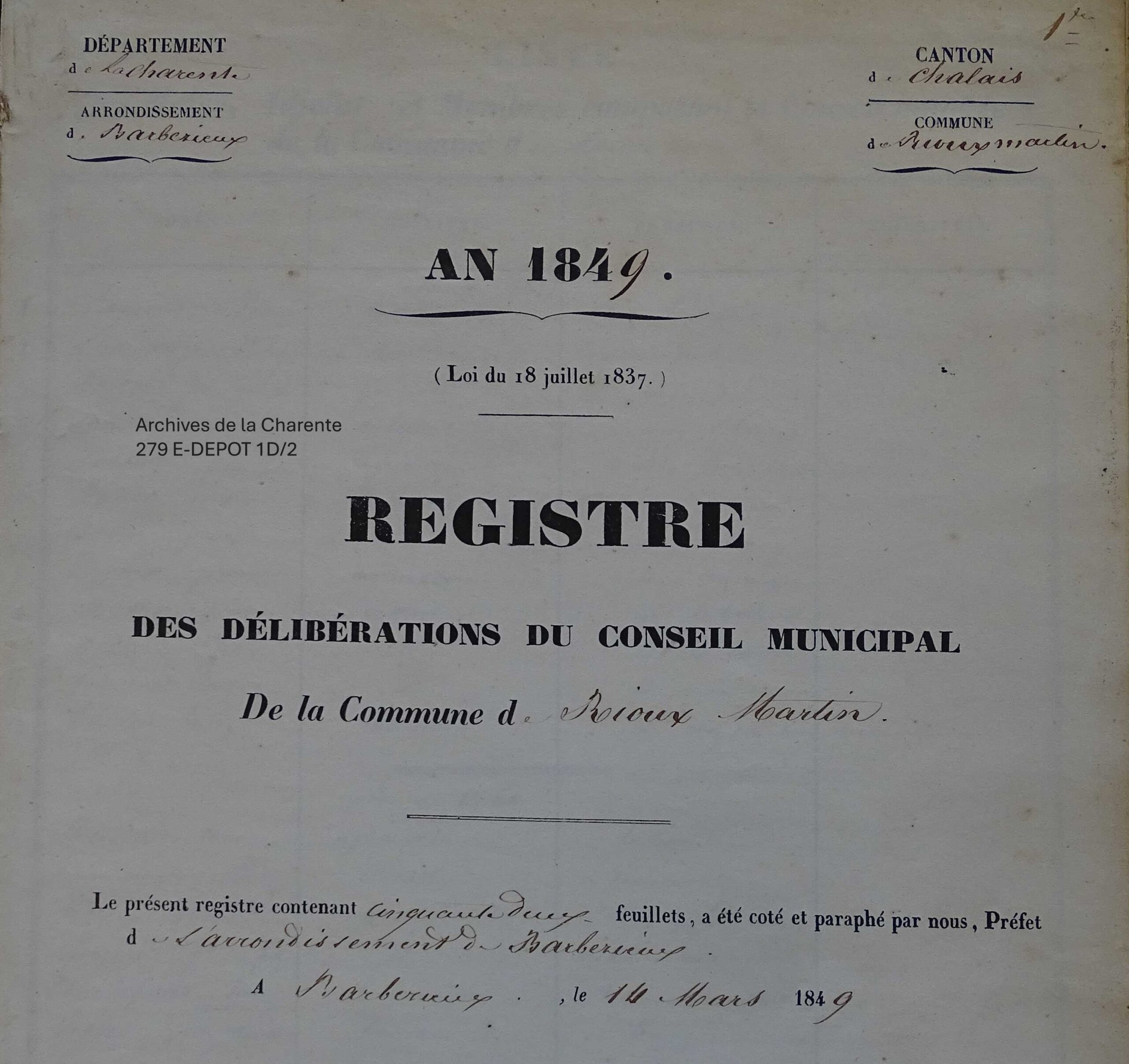 Le 26 juin 1846, le Conseil municipal est renouvelé. Le vote est encore censitaire à cette époque, c’est-à-dire que seuls les hommes de la commune payant un minimum d’impôts avaient le droit de voter. Rioux-Martin compte alors 760 habitants dont 228 hommes âgés de plus de 21 ans. Le PV de ce vote ne mentionne pas le nombre d’électeurs, mais indique que 32 électeurs seulement ont voté. Le taux de participation est probablement fort comme pour toute élection municipale, ce qui laisse penser que les habitants ayant le droit de voter ne représentent alors que de l’ordre de 20% des hommes. Le suffrage censitaire cèdera la place au suffrage masculin universel en 1848, mais deux ans plus tard de nouvelles conditions vont à nouveau réduire drastiquement le nombre d’électeurs. Il faudra attendre 1884 pour que l’élection au suffrage universel soit définitivement établi, en tout cas pour les hommes (et en 1945 pour les femmes).