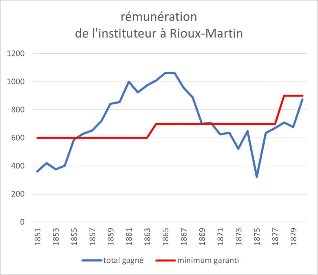 C’est à partir de la loi Falloux en 1850, déjà citée, qu’un minimum de revenus est instauré pour les instituteurs : 600 francs annuels. Si le fixe de 200 francs et les contributions des familles ne permettent pas d’arriver à ce total, la commune et le département combleront la différence ; et si le total dépasse ces 600 francs, cela augmentera d’autant la rémunération de l’instituteur. Chaque année donc, le conseil municipal examine au vu des contributions familiales de l’année précédente s’il y a lieu de verser un complément pour atteindre les 600 frs, portés à 700 frs en 1864 puis à 900 frs en 1878. L’examen de ces comptes permet de voir évoluer la rémunération de l’instituteur de Rioux-Martin dans les années 1850-1880 et cela donne le tableau suivant :