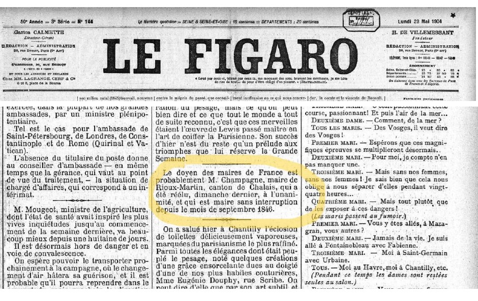 Peu de temps après, le 1er juin 1904, le journal La Mayenne reprend cette information : « le plus vieux des maires est un Charentais, M. Champagne, maire de Rioux-Martin, maire sans interruption depuis septembre 1846. Il a deux années de plus d’exercice que le maire de la Bégude de Mazenc [Drôme], à qui beaucoup avaient décerné le brevet fort honorable, mais en somme pas très envié, de l’ancienneté ». Mais on pourrait citer également Le Figaro, La Libre Parole, La Patrie, Le Siècle, Le Temps, l’écho rochelais, l’écho Saintongeais, la Dépêche (Toulouse), Le Journal de Montélimar.