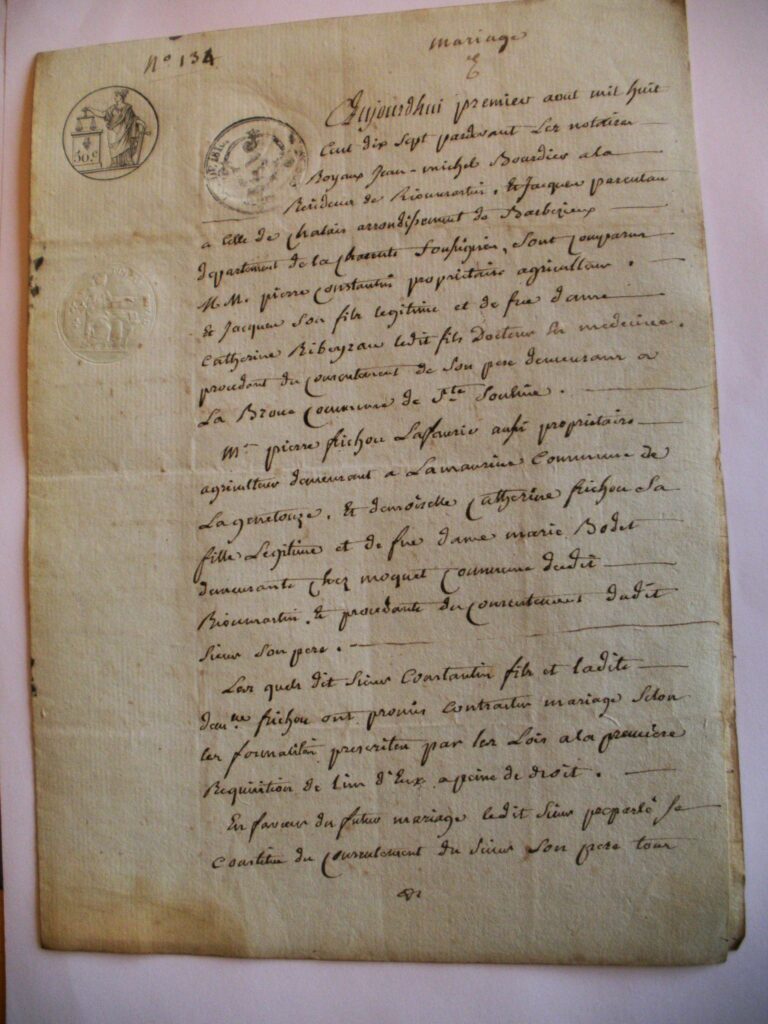 Autre grande ressource, les actes notariés. Certains sont conservés dans les familles, d’autres sont encore présents dans les études des notaires concernés, ou pour les plus anciennes (en principe plus de 100 ans) aux archives départementales ; certaines archives enfin ont tout simplement disparu… Sauf exception, les minutes des notaires ne sont pas numérisées et donc inaccessibles sur internet : le volume à traiter est considérable.