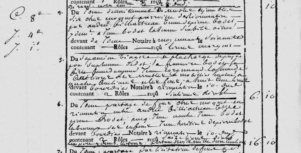 Depuis l’ordonnance de Villers-Cotterêts1 (1539) et surtout celle de Blois (1581), tous les actes notariés doivent être conservés et ils sont soumis à « l’insinuation » puis au « contrôle des actes » qui permet d’en trouver une trace écrite même si elle reste ténue. Ainsi, on ne trouve pas aux Archives de la Charente de minutes du notaire Bourdier à Rioux-Martin antérieures à 1770, les précédentes n’ont manifestement jamais été versées et semblent perdues pour de bon. Mais on trouve mention de l’acte du 10 avril 1760 entre Andrée Fillatreau et ses fils Jean l’aîné et Jean le jeune (en savoir plus) sur le registre du contrôle des actes. C’est souvent peu lisible et très sommaire, mais au moins ça montre que tel acte a bien été passé.