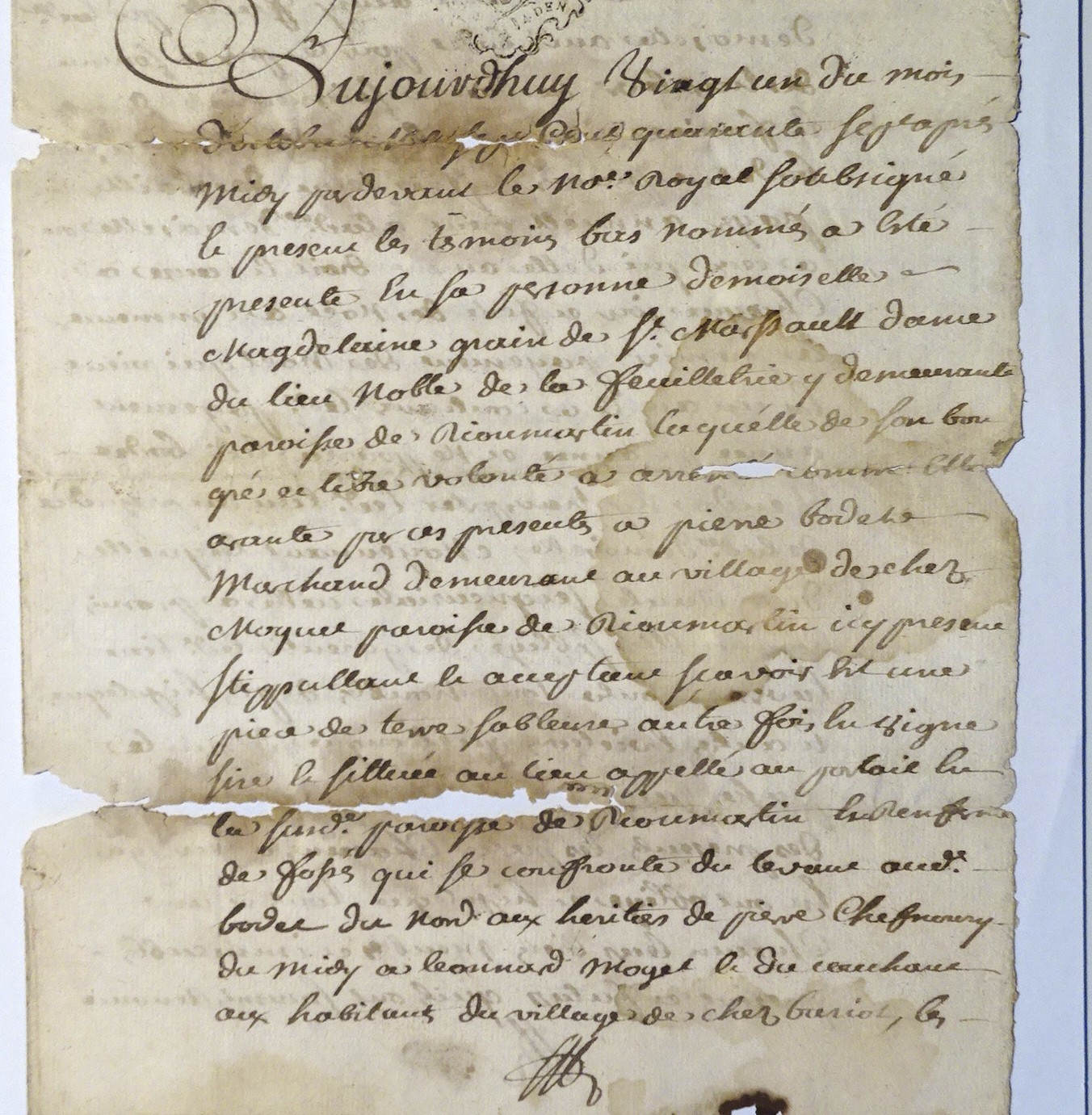Certaines familles sont adeptes pour les vieux papiers du « classement vertical » vers la cheminée ou la corbeille… d’autres au contraire ont le souci de la conservation et c’est le bonheur du généalogiste ! C’est ainsi qu’un certain nombre d’actes sont aujourd’hui en ma possession, certains datant du milieu du XVIIIe siècle, d’autres plus nombreux datant du XIXe, aussi bien du côté des Nau (Constantin, Thomas, Frichou) que du côté Lamaronnière (Daire, Magrangeas, Nalbert, etc.). L’acte figurant en en-tête de cet article fait partie des actes conservés à Moquet : il concerne un contrat de ferme souscrit le 21 octobre 1747 entre « Magdelaine Grain [Green] de St Marsault, dame du lieu noble de la Feuilletrie », et « Pierre Bodet, marchand, demeurant au village de chez Moquet ».